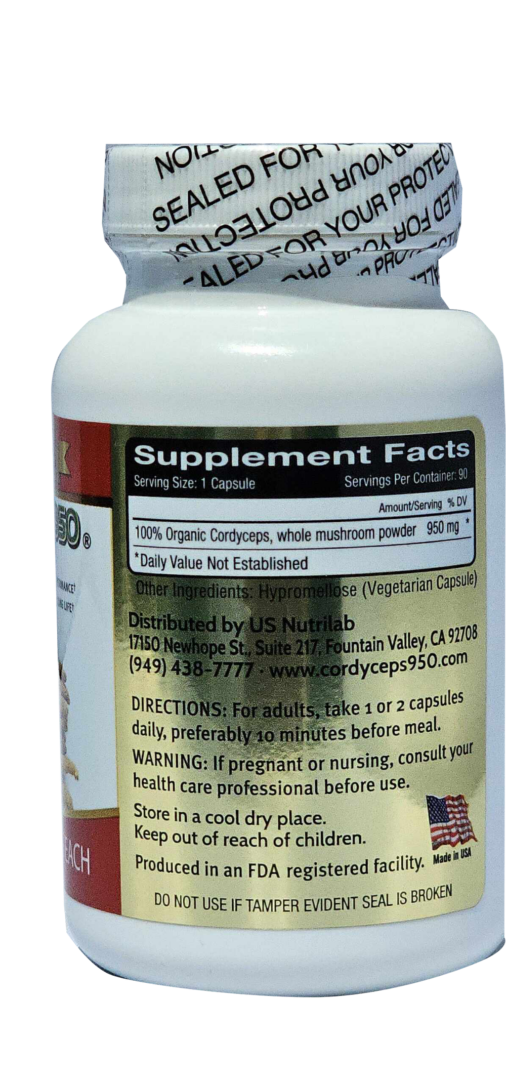 Cordyceps is considered a very rare herb that lives on certain caterpillars in the high mountain of regions in the East. Cordyceps are found on the mountain with altitude from 4000 - 6000 meters in the geographical area of Himalayan and the region is snow-covered year round. Because of the high elevation and extreme climate, it is very difficult to find this rare herbs in the wild. After 10 years researched, and applied biotechnology, the top rare varieties of cordyceps from Tibet are now successfully farmed in completely closed and controlled environment with strict stringent standards from USDA. Cordyceps 950® contains 100% Organic Cordyceps.